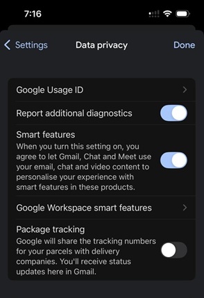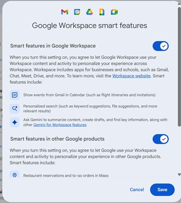 The images at the top left of this article shows the gmail settings status of smart compose, smart reply and Smart Workspace as “ON”  before they were switched off by the author. The image on the right is from gmail settings on a desktop and shows that the Google Workspace Smart features were turned on by default without any intimation or consent of the user.