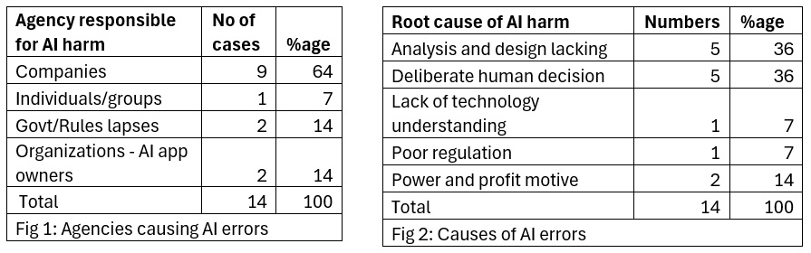 The above cases and another additional 7 harmful AI cases (details in Annexure) were analysed for cause and the agency that was responsible for the lapse. The pivot chart on the agency responsible is shown in Fig 1 below. The pivot chart on the causes is shown in Fig 2 below.