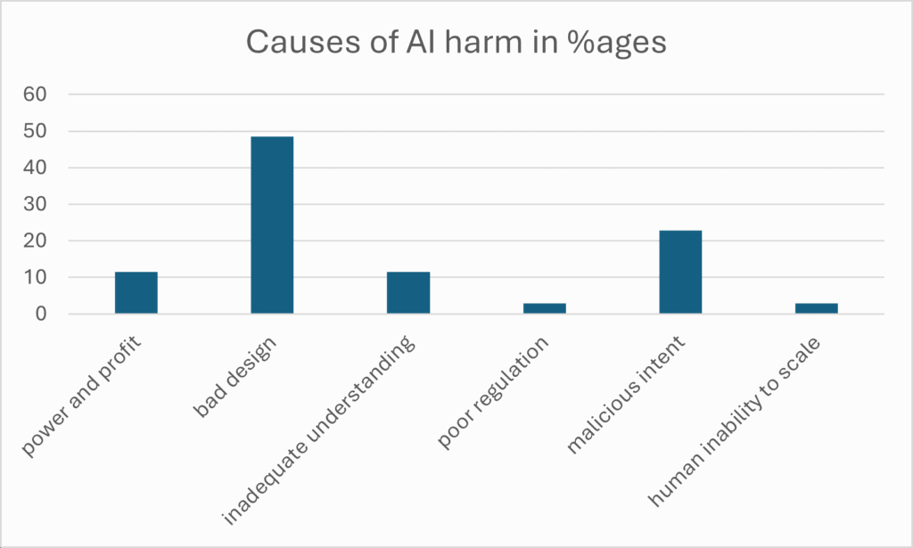 All the causes listed above are attributable to human failures. They are bad design, power and profit motive, malicious intent, inadequate technology understanding, poor regulation and inability of humans to scale up with new skills to operate AI systems.