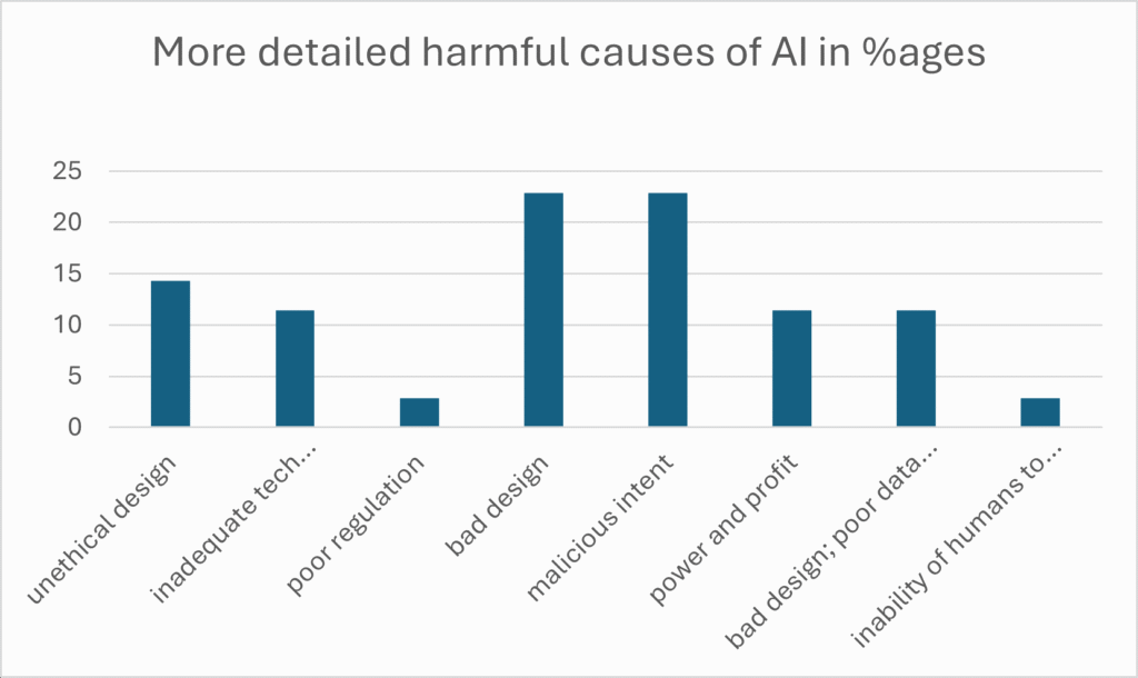 Harm caused by the malicious intent of humans at 22.86 % (chart 1) is the second largest component of harm caused by AI systems.  This category of harm is the caused by criminals, thieves and other misguided individuals, groups or organizations. It constitutes the creation of deepfakes, human deception, psychological manipulation using AI, hacking , cyber-attacks, harm to children and such activities.