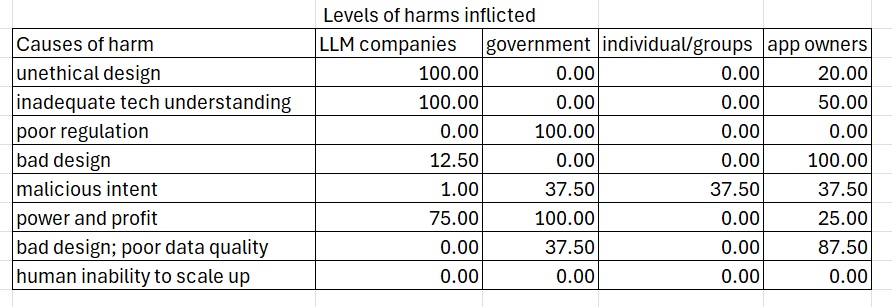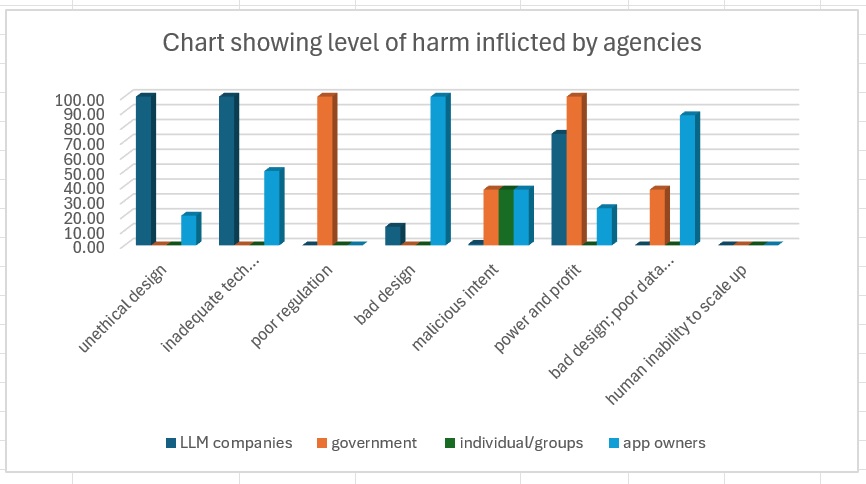 Based on the above study, the main causes of AI harm infliction have been attributed to different stakeholders namely LLM companies (MNCs), government, Individuals/groups and Application owners/developers. Table 1 and chart 3 below show the amounts of harm inflicted by different agencies.